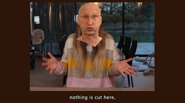 Dull heartbeat rhythm, a disembodied head lets its lips vibrate in a tonally slurpy way. The frequency increases until the black image background is replaced by alternating film shots of five people who were/are extremely popular in their field: Influencer, pop singer, Reich Chancellor, rapper, US President. The verbal messages of the background videos weave together a text. The head covers the heads of these people, follows the movements of the bodies and continuously produces sounds.