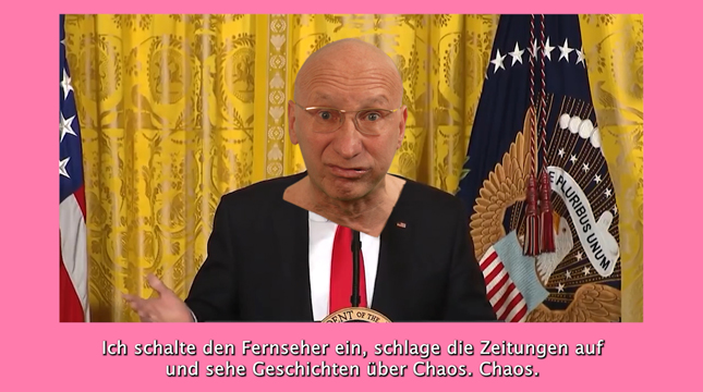 durch sich abwechselnde Filmaufnahmen von fünf Personen, die auf ihrem Gebiet äußerst populär waren/sind, ersetzt wird: Influencerin, Schlagersängerin, Reichskanzler,
