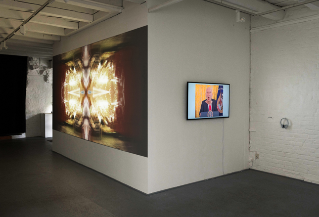 Rapper, US-Präsident. Die verbalen Botschaften der Hintergrundvideos weben zusammen einen Text. Der Kopf überdeckt die Köpfe dieser Personen, folgt den