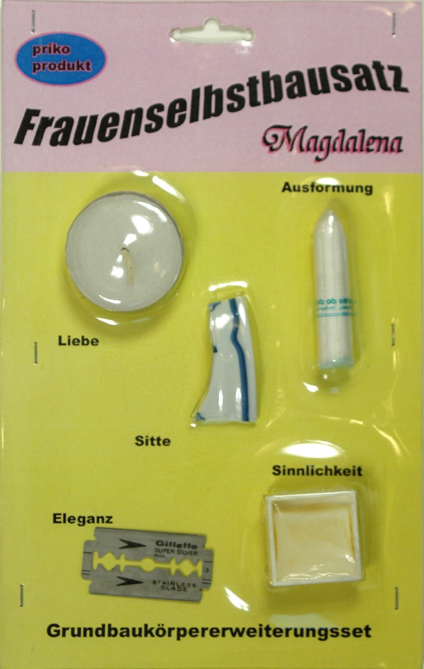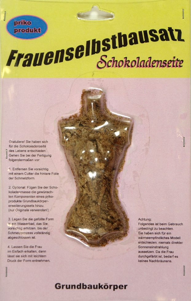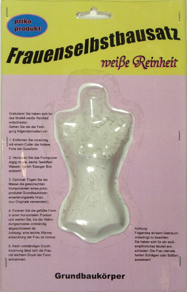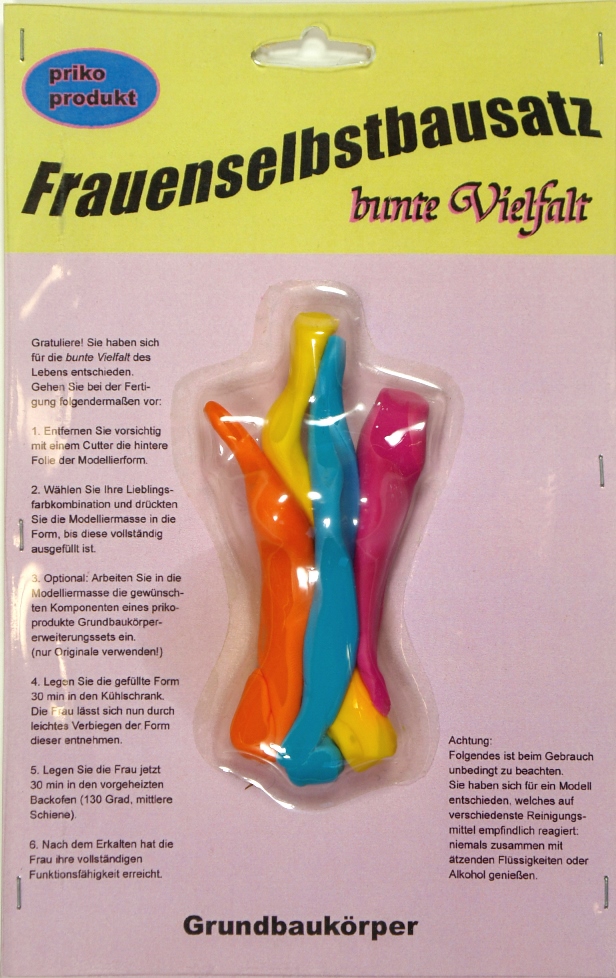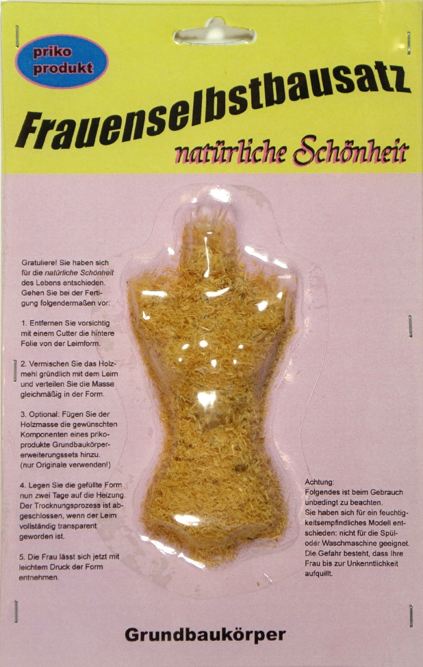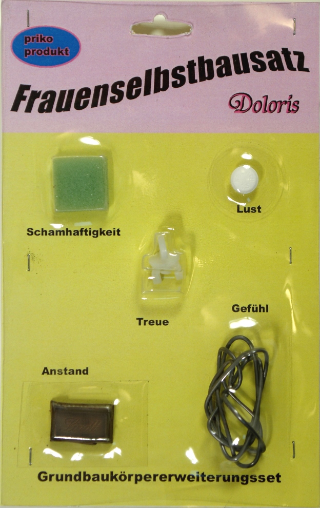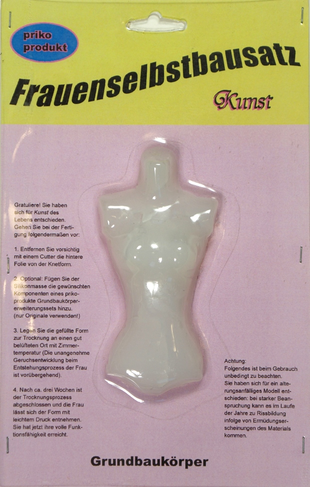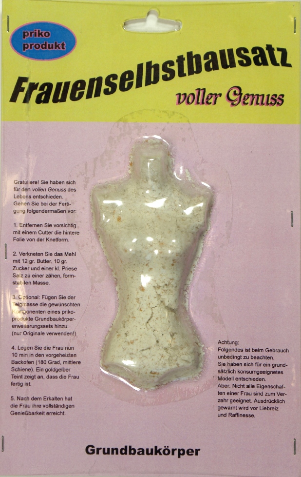 Sie sind unzufrieden? Sie finden keine passende Frau? Das muss nicht sein. Immer mehr Männer stellen fest, dass die Frau von heute nicht mehr ihren Erwartungen entspricht. Die gesellschaftlichen Veränderungen der letzten Jahrzehnte haben eine tiefe Kluft zwischen den Geschlechtern entstehen lassen. Und der moderne Mann ist nicht mehr bereit, dieser Entwicklung tatenlos zuzusehen. Priko hat nach intensiven Marktanalysen ein Produkt entwickelt, das den Mann von der gesellschaftlichen Realität unabhängig macht: den Frauenselbstbausatz. Entscheiden Sie sich für den Grundbaukörper Ihrer Wahl. Gestalten Sie ihn individuell mit Hilfe des Grundbaukörpererweiterungssets zur Frau Ihrer Träume.