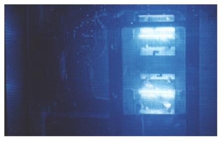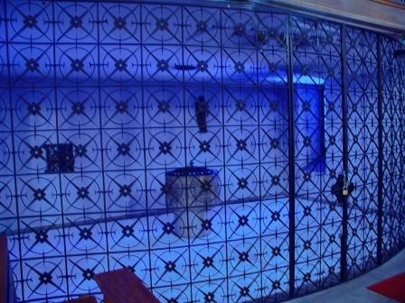 Ein Halogenscheinwerfer taucht durch das blau verglaste Fenster den Raum,