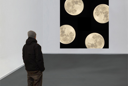 The recorded video image of the moon wandering through the focus has been arranged fourfold in a circle so that a focus results again, a form of aperture that seems to open and close.