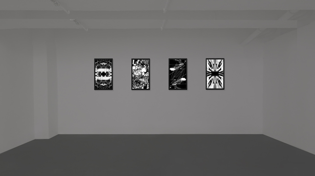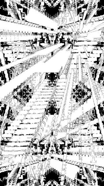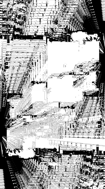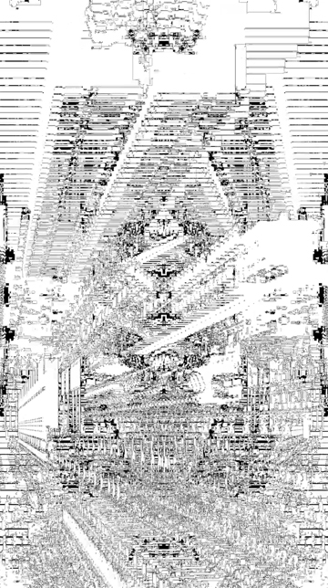 The video work "b/w_01020304" is based on the same source material as the video sculpture "early days of animation". It is based on a glitch of a YouTube video, ultimately the result of a "read error" of a program. For this work, too, the material filmed directly from the screen was digitally processed in many steps without adding further image information. The result is four graphic b/w sequences in portrait format. Mirroring, staggering and a nervous rhythm of the sequence of images as the central organizational principles of these works create a graphic associative space that constantly oscillates between pattern and scene, between architectural and mechanical structures, between factory hall and outer space.