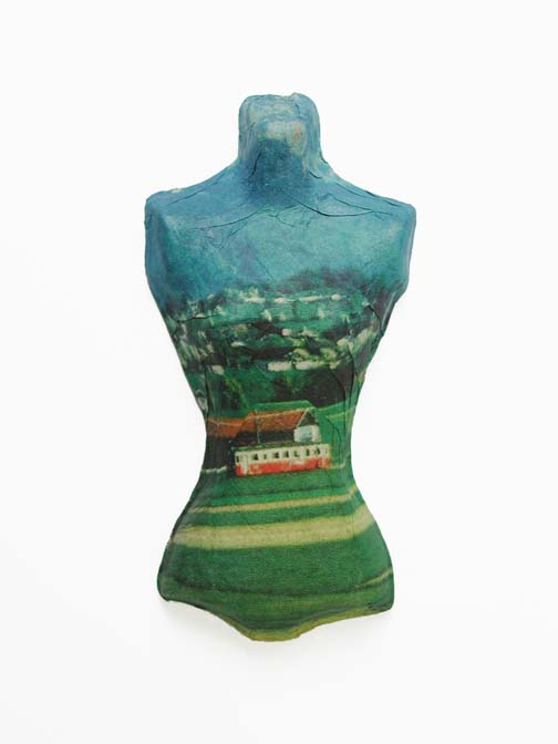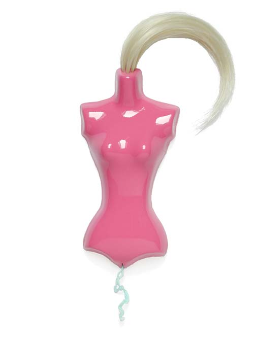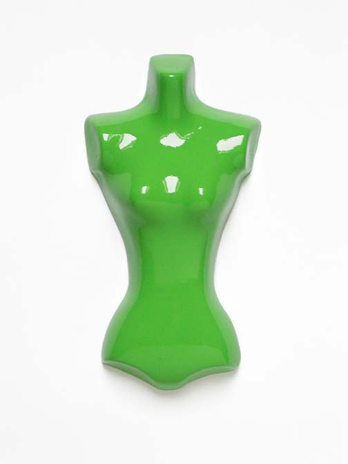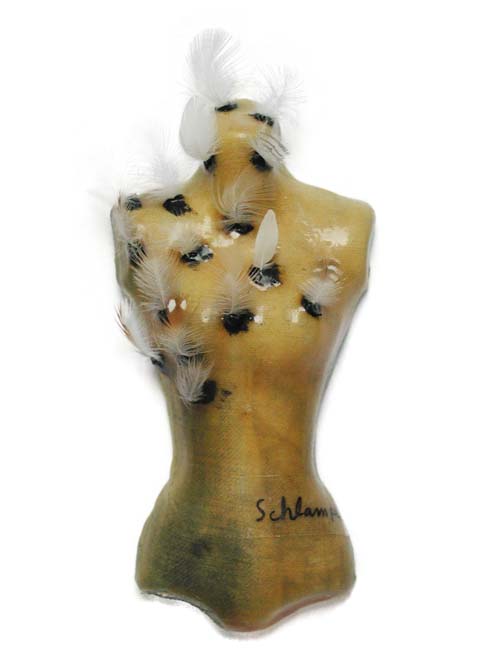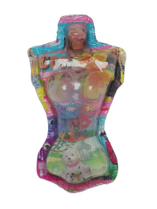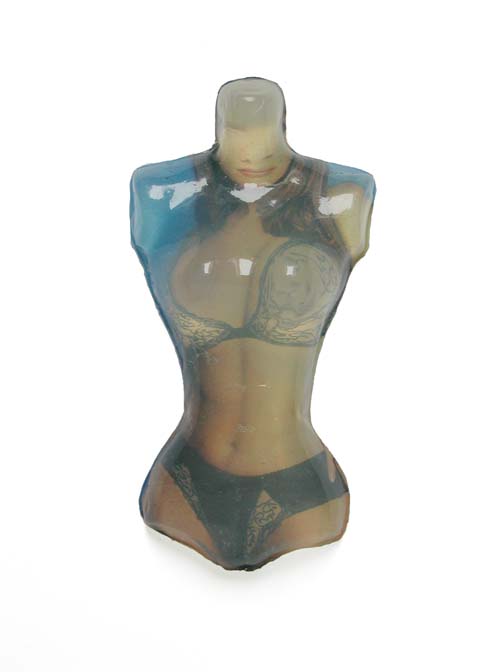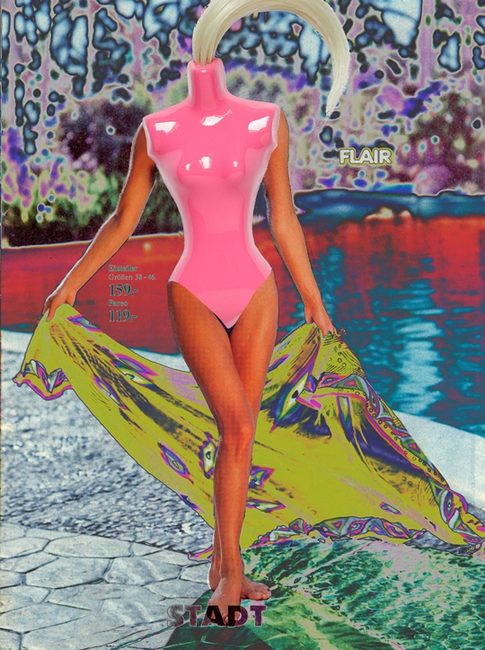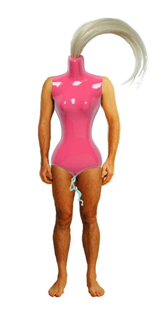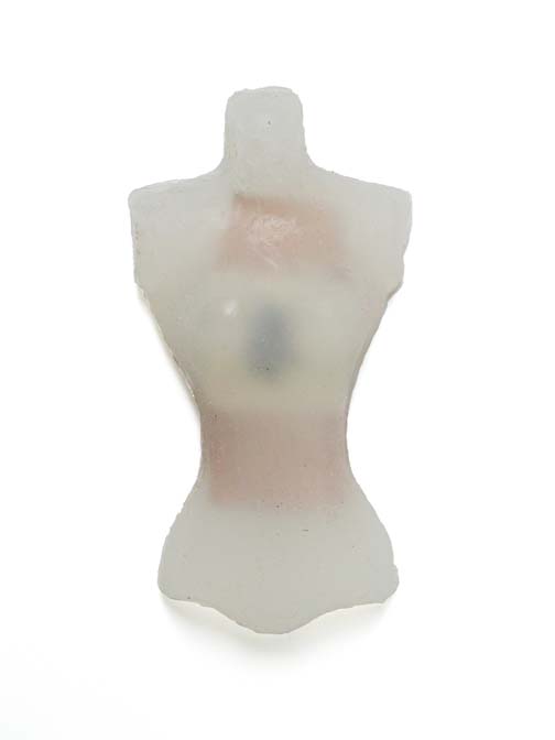 Auf der Straße habe ich eine transparente Plastikhalbschale gefunden (ich sammle Plastiksplitter auf der Straße für die bildnerische Produktion). Es ist eine Vorderansicht eines weiblichen Torsos, gemacht um Barbiepuppen-Nachkaufkleider plastisch in ihren Verpackungen wirken zu lassen.