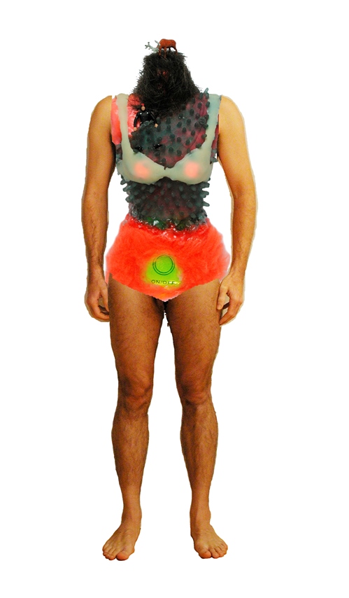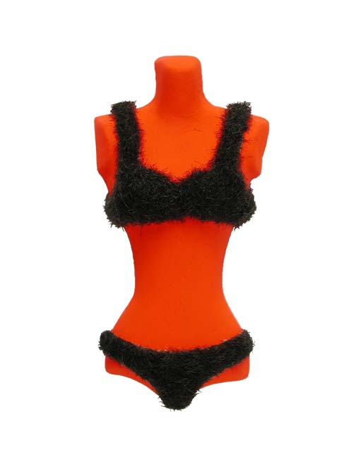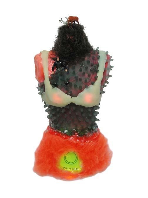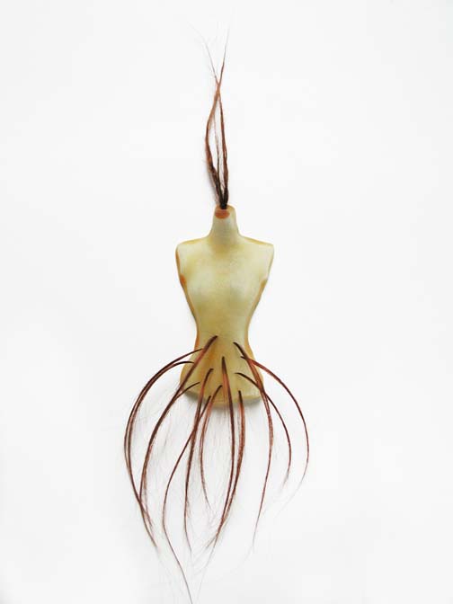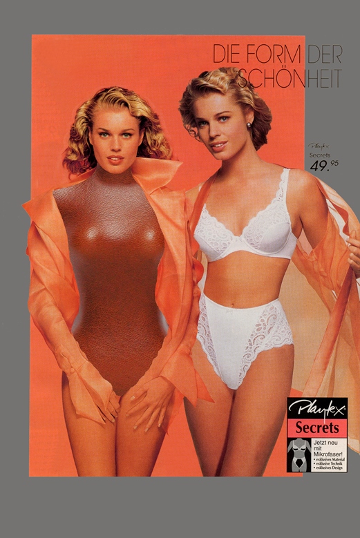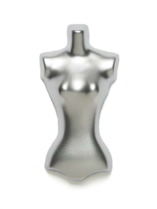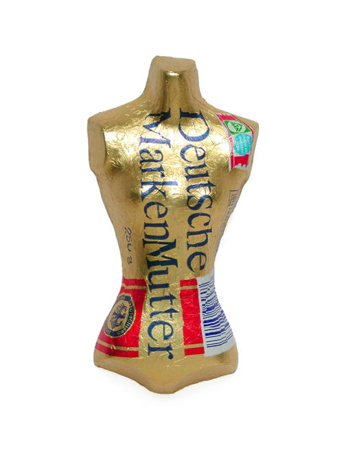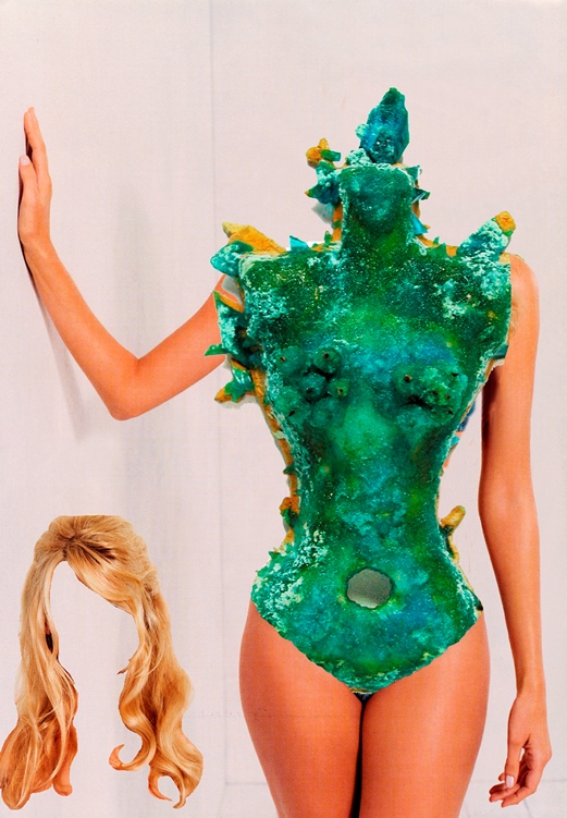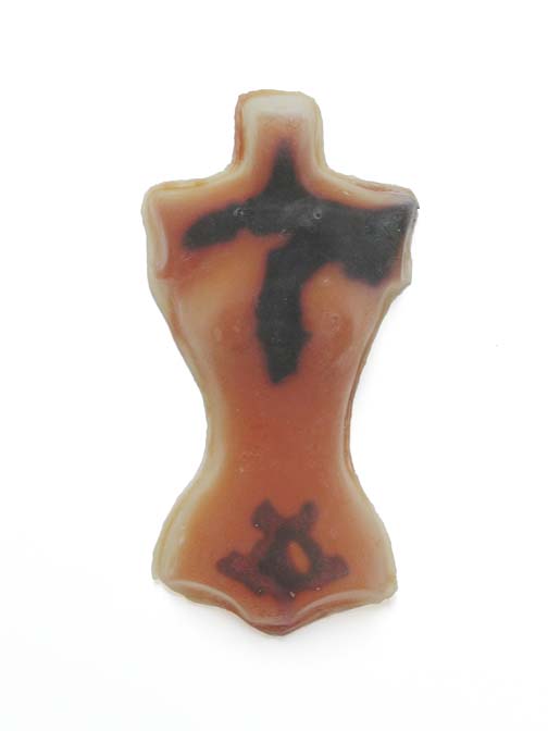 Auf der Straße habe ich eine transparente Plastikhalbschale gefunden (ich sammle Plastiksplitter auf der Straße für die bildnerische Produktion). Es ist eine Vorderansicht eines weiblichen Torsos, gemacht um Barbiepuppen-Nachkaufkleider plastisch in ihren Verpackungen wirken zu lassen.
