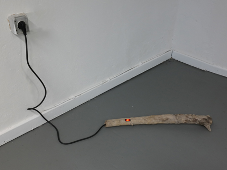 Ein weiterer Bestandteil dieser Arbeit, die am Ende aus mindestens drei Modulen bestehen wird, ist ein glattgewaschenes, armdickes Stück Ast, in das ein roter Kippschalter eingebaut wurde. An einem Ende befindet sich ein Stromkabel mit Stecker. Schaltet man den Kippschalter ein, leuchtet er rot.
